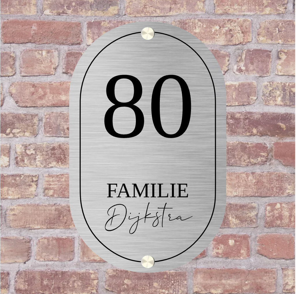 Een mooi ovale naambordje voor bij de voordeur, gemaakt van Dibond of Plexiglas.
