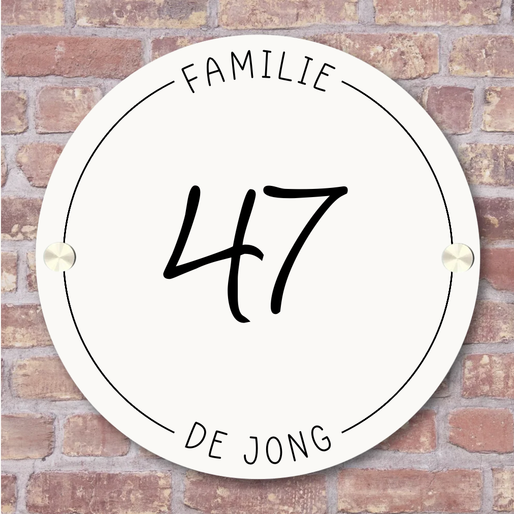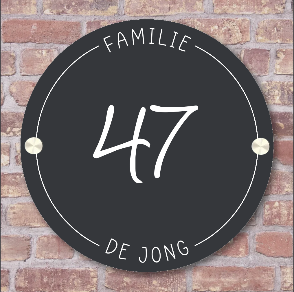 Een mooi rond naambordje voor bij de voordeur, gemaakt van Dibond of Plexiglas.