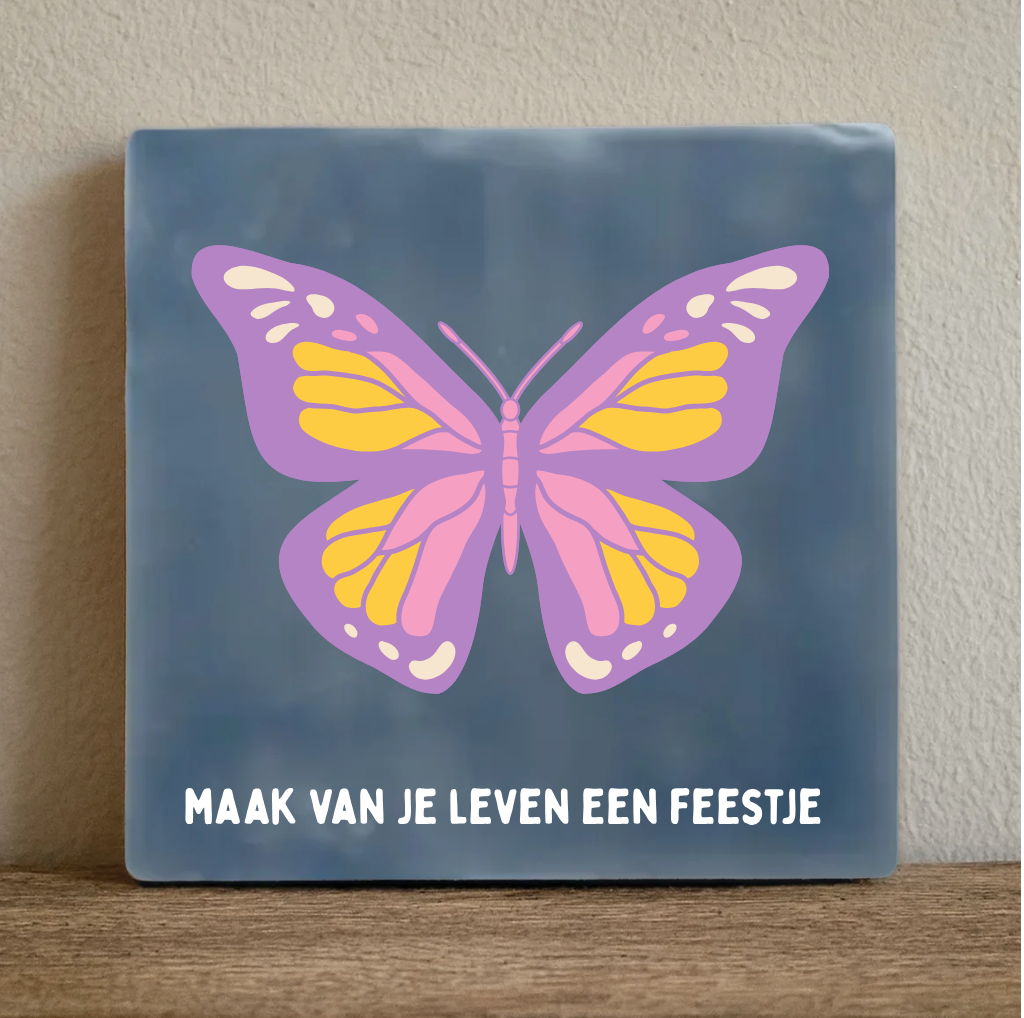 Wij voorzien onze tegels van een print die altijd goed blijft. Wij bestickeren niet. Het is toch geweldig dat je dit tegeltje helemaal naar wens kunt personaliseren?